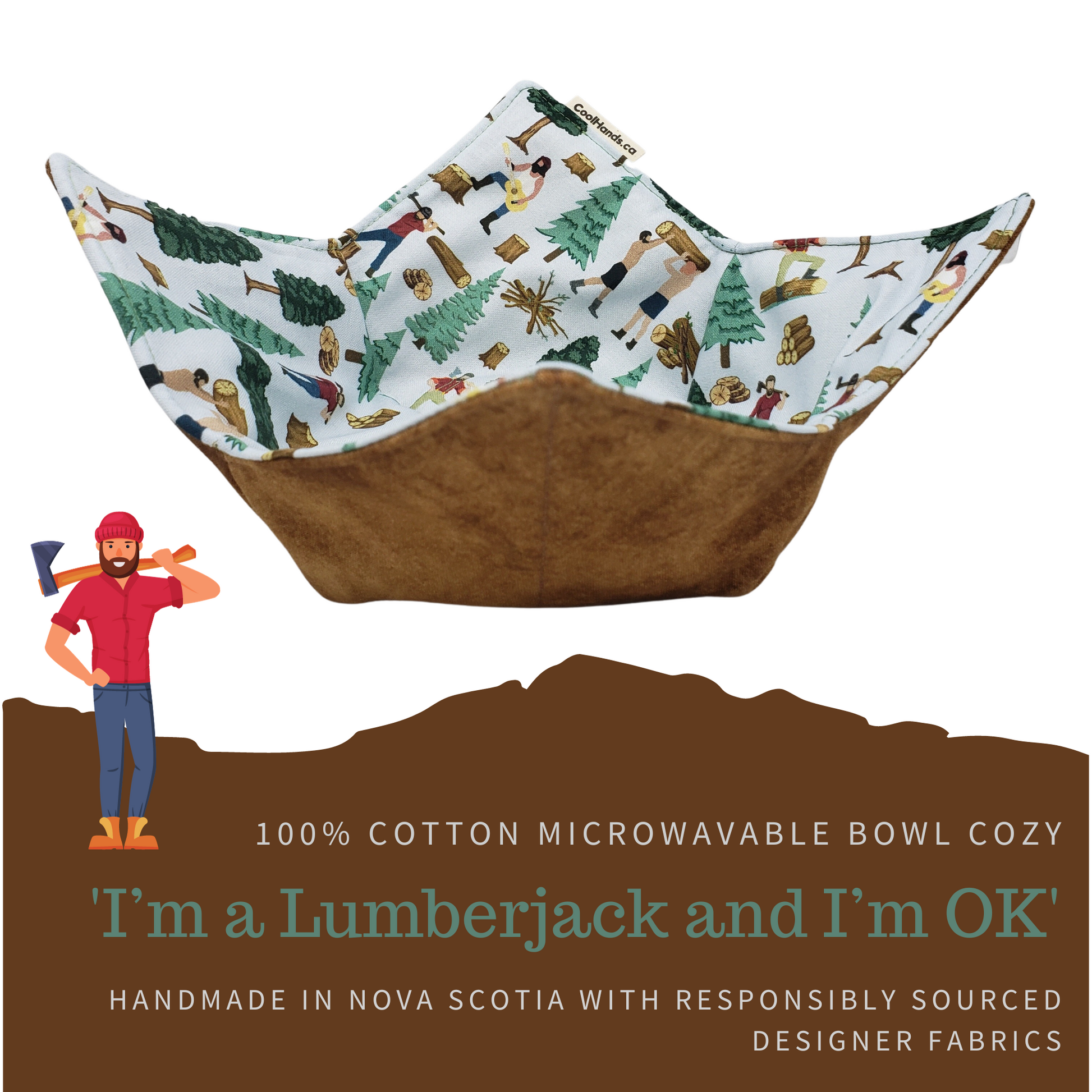 High-quality 100% cotton, microwave-safe bowl cozy, machine washable. Fits a standard bowl with a 4-8 inch diameter.